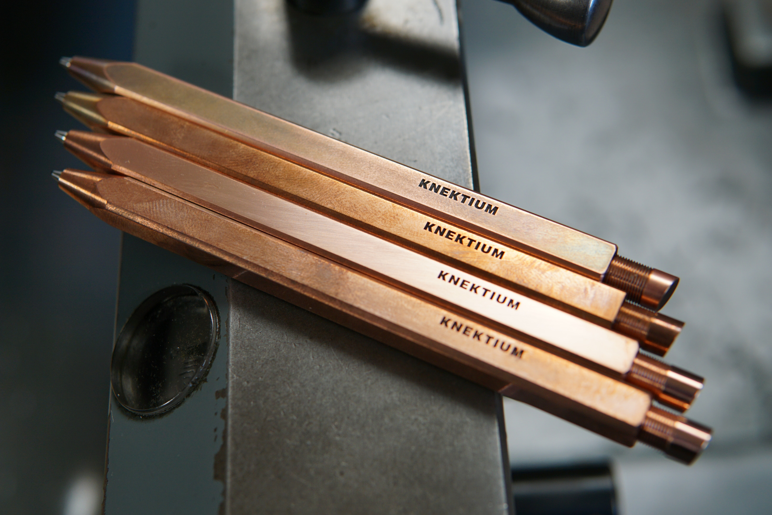 Knektium C2 är ett enkelt men vackert skrivinstrument där design och material står i fokus. Kroppen, som är helt integrerad med spetsen, är tillverkad ur en enda bit 99,95% ren koppar. Glansen från den lätt borstade ytan skapar en perfekt balans med mönstret från de finmetriska gängorna och den lasergraverade logotypen.